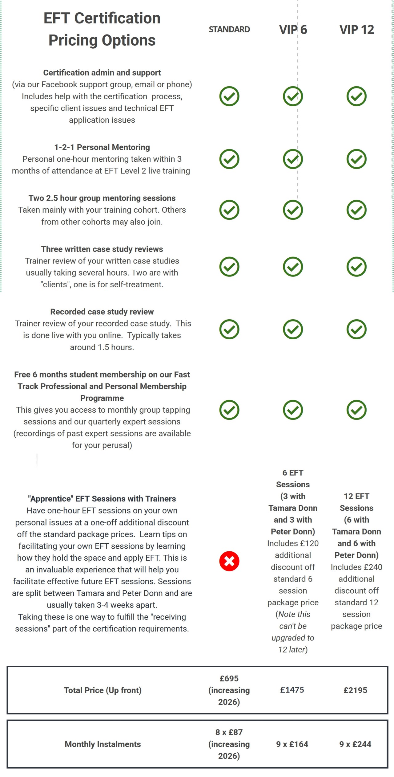 You can extend the 12-month certification period by attending at least EFT Level 2 again (with us, if we have dates and spaces available) as a refresher, and your 12 months starts again from the last day of second Level 2 training. Once you have enrolled in the certification programme, if you take additional time to complete the certification over and above 12 months then (apart from the cost of refresher training) there is no additional fee to pay unless the practitioner programme has increased in price in which case you pay the difference. You may also need to book an additional Mentoring or two as you need to do at least 6 hours in the 12 months leading up to certification.